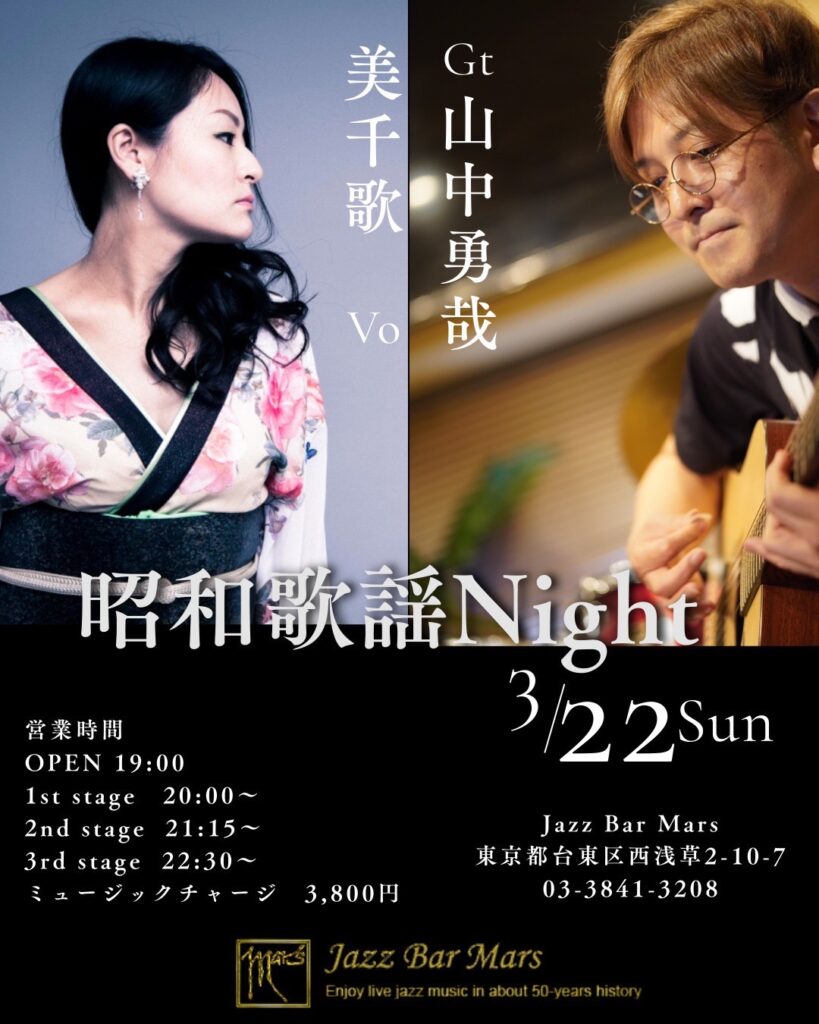 ライブ情報 3/22 昭和歌謡ナイト @浅草マルス Schedule 2026.02.11昭和歌謡ナイト日時: 3/22(日) 20:00〜 3ステージ実施 1st 20:00〜 2nd 21:15〜 3rd 22:30〜 場所: 浅草マルス 料金: MC 3800円 w/ 山中勇哉(gt)【マルス初出演】